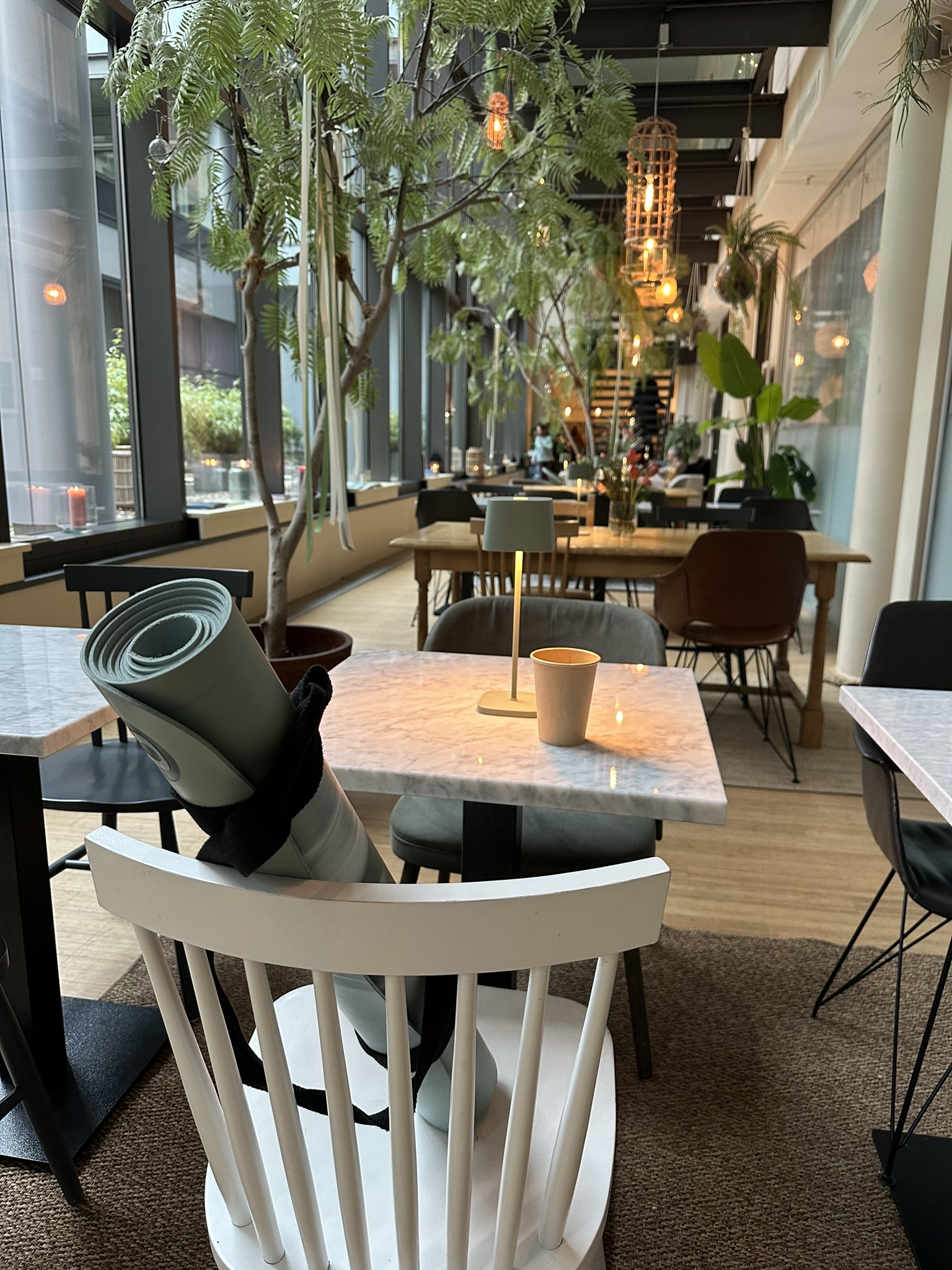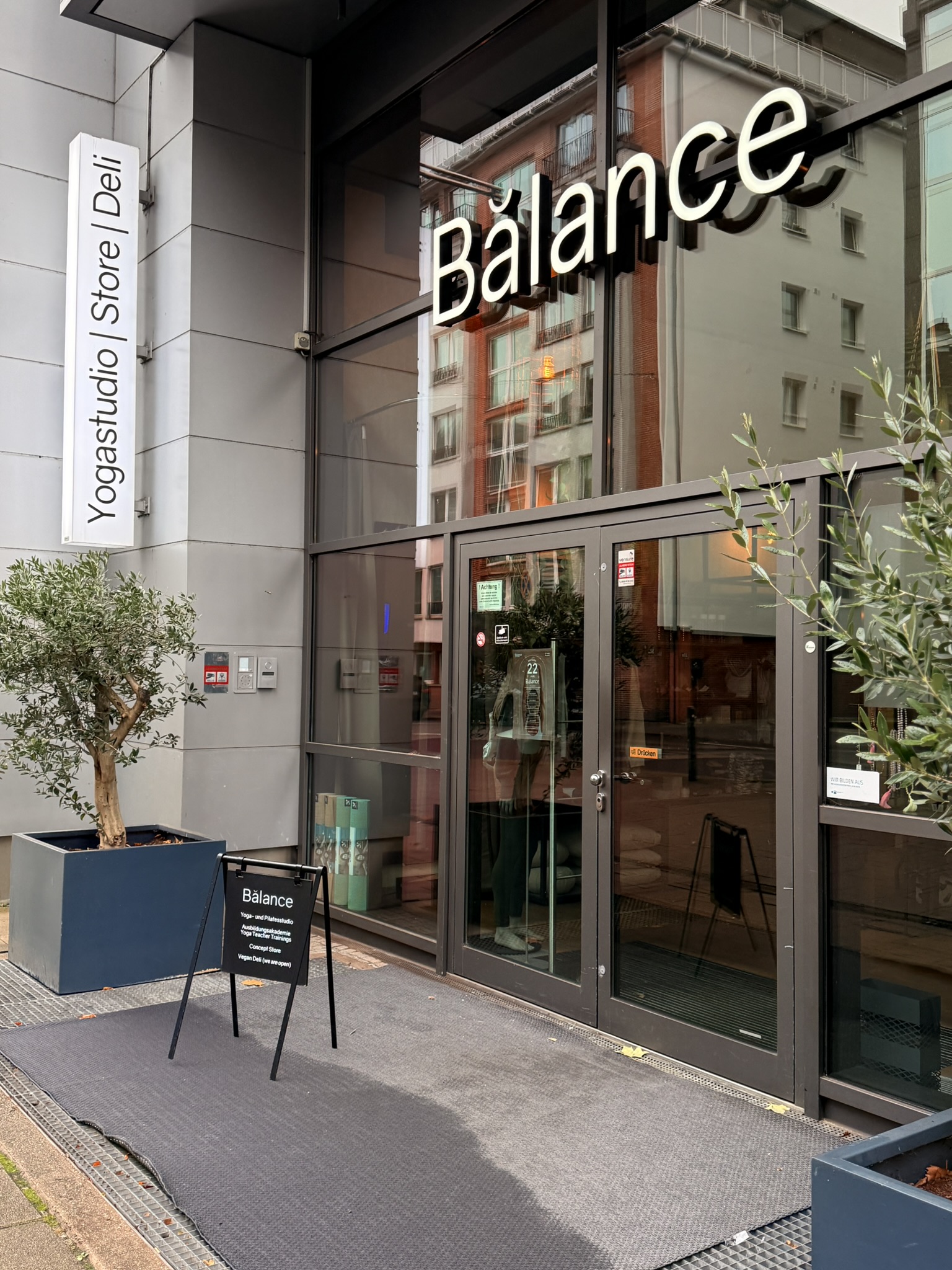 The perfect post-class spot: Balance Deli Frankfurt. The deli attached to Balance Yoga in the heart of Frankfurt — a bright, plant-filled space with indoor trees, marble tables, and the kind of calm energy that makes you want to linger. The menu is mostly vegan and covers everything from matcha lattes and flat whites to avocado bread, smoothie bowls, and daily lunch specials. Yoga mats propped against chairs, candles on tables, and a crowd that just came from class. What to know: pairs perfectly with a Balance Yoga session upstairs, and the matcha latte is worth the detour on its own.