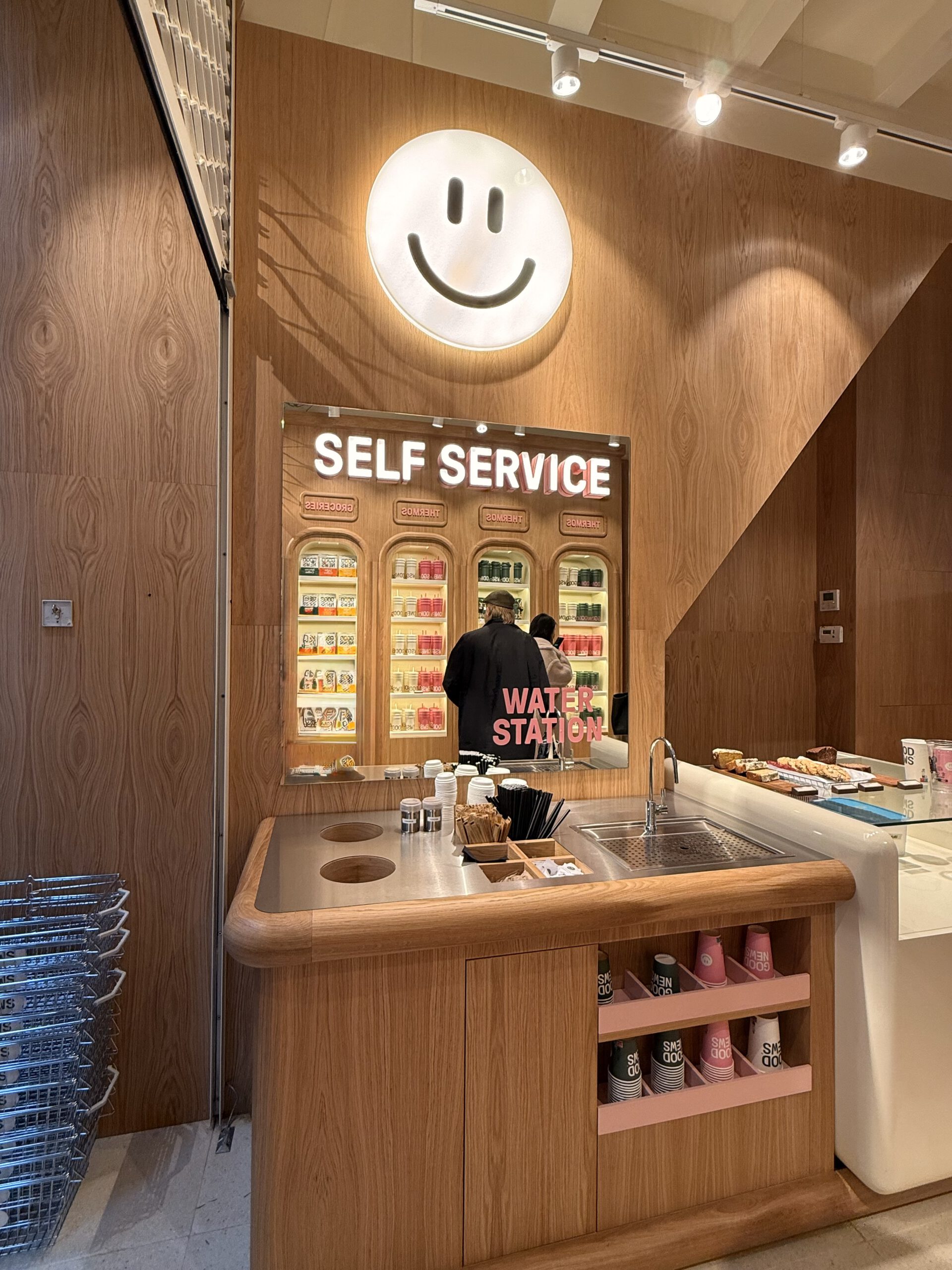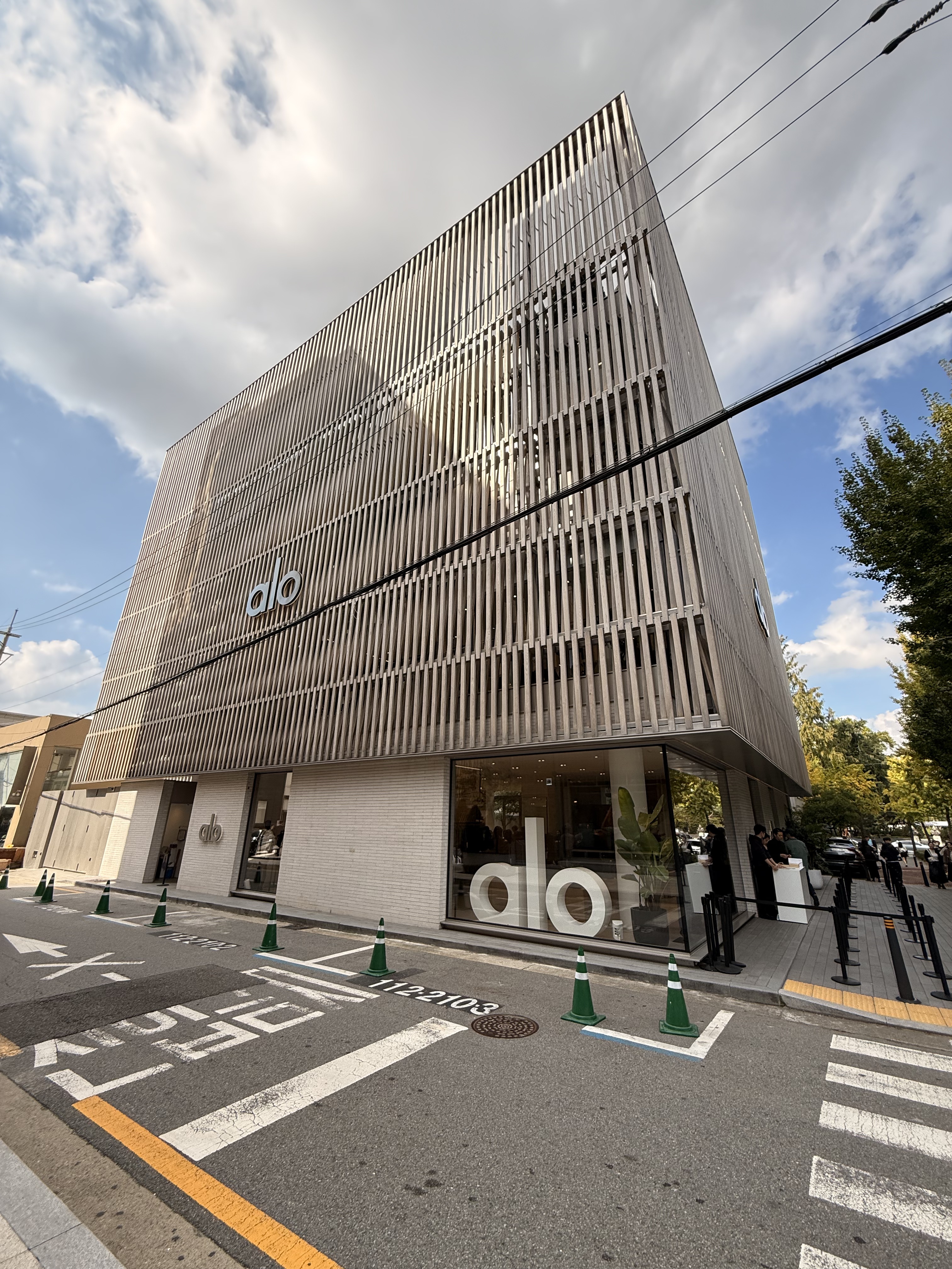 Alo Yoga's stunning flagship in Seoul — a multi-story architectural gem with wooden slatted façade and floor-to-ceiling windows. Inside, dreamy pink interiors with oversized Alo letters, lush tropical plants, and playful installations including the iconic cloud mascot. Premium yoga and athleisure wear in one of the most Instagrammable wellness retail spaces in Asia.